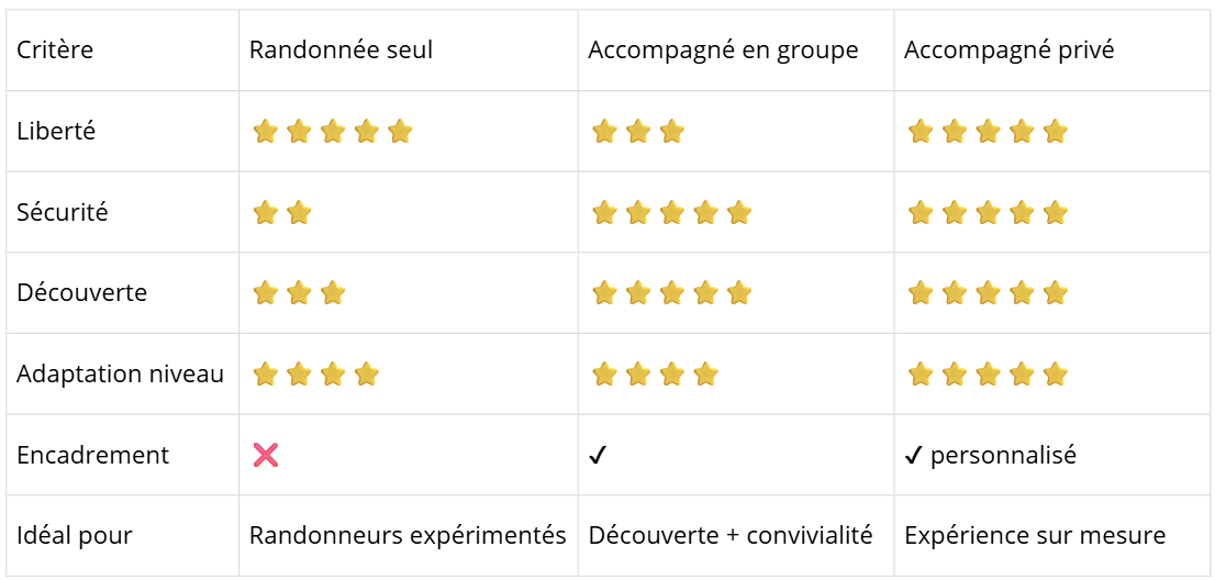 Une question revient fréquemment chez les visiteurs : vaut-il mieux randonner en autonomie ou faire appel à un guide ?