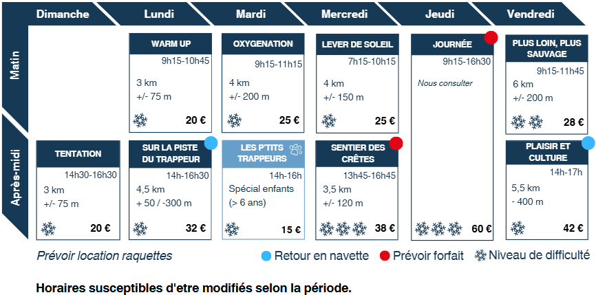 Suitable for all levels, our snowshoe excursions allow you to explore the mountains at a gentle pace or in a more athletic way, depending on your preferences. We offer: