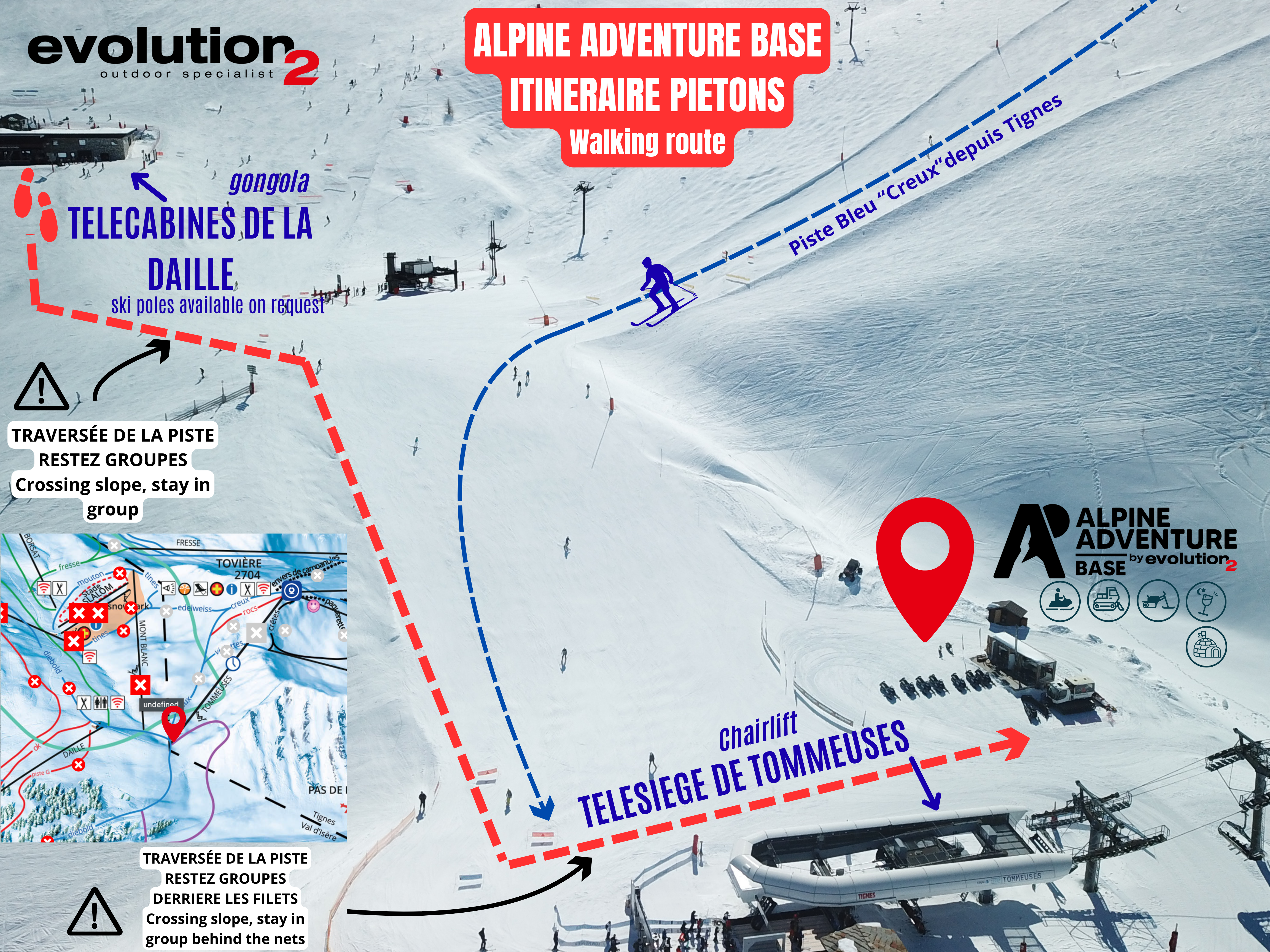 L’activité se déroule sur un circuit sur le Pas de Tovière entre Mont-Blanc, sommet de Bellevarde, de la Sache et une vue imprenable sur le lac du Chevril et le barrage de Tignes.