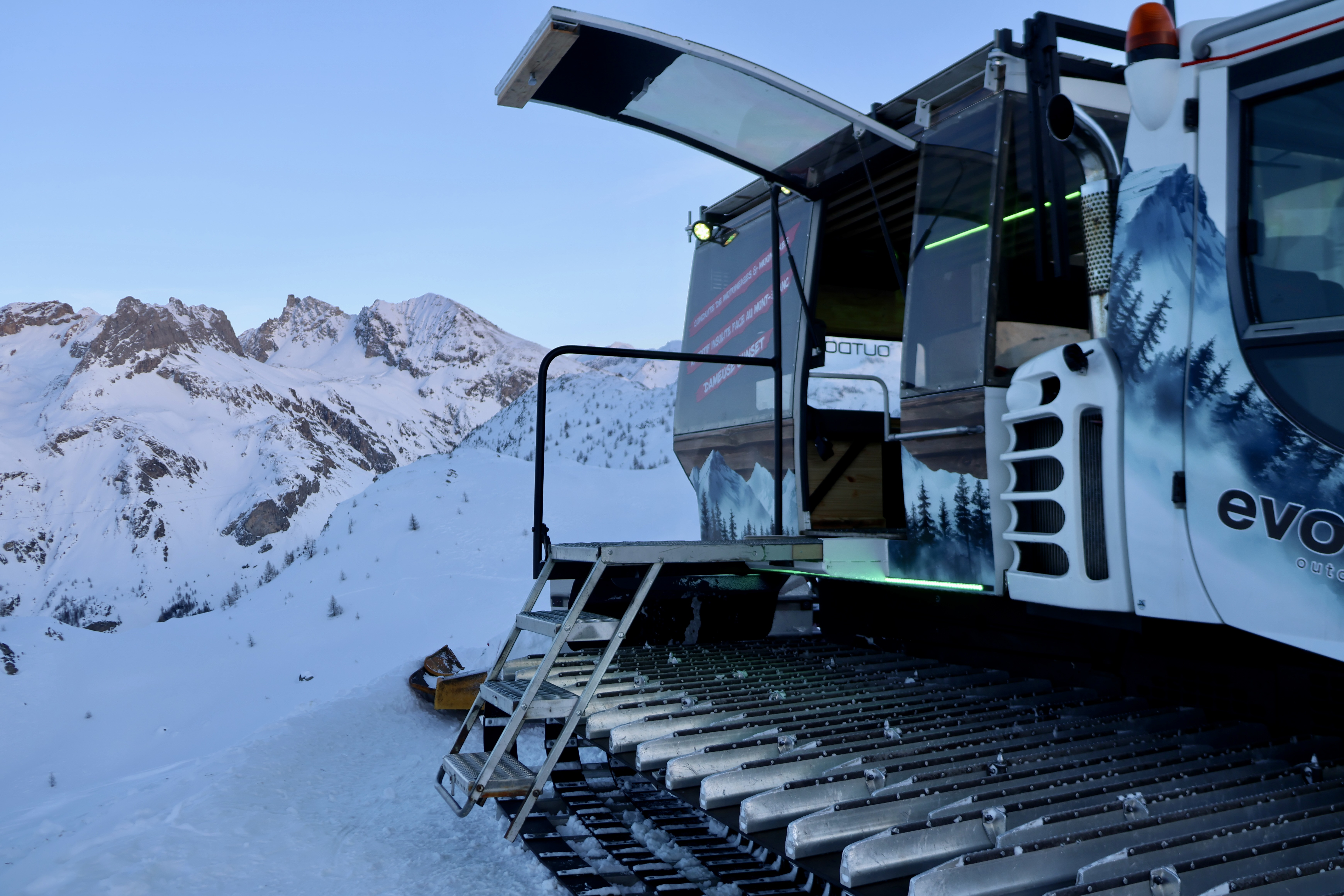 Parlons un peu de la dameuse ! Cette dernière a été aménagé avec soin. Vous y trouverez un plafond lumineux, des LED, des banquettes confortables et un système son avec la possibilité de se connecter en Bluetooth avce la musique de votre choix . Tout pour se sentir bien et passer une fin de journée inoubliable.